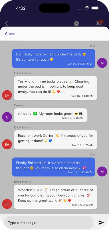 通过家务聊天功能保持家庭联系和有效沟通,这个功能专为促进关于特定任务和家庭责任的对话而设计。无论是需要帮助、有疑问,还是值得表扬,家务聊天都能让每个人保持信息同步。
