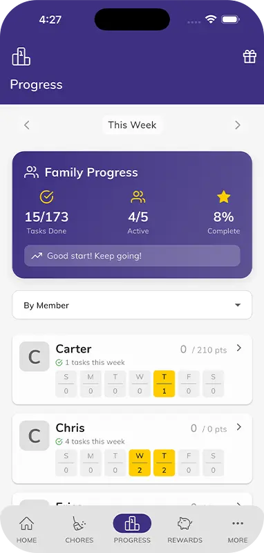 家族進捗ダッシュボードがあれば、家庭を円滑に運営しながら、お子様に責任感、チームワーク、やり遂げることの重要性を教えるために必要なすべてが揃います。🏠💪