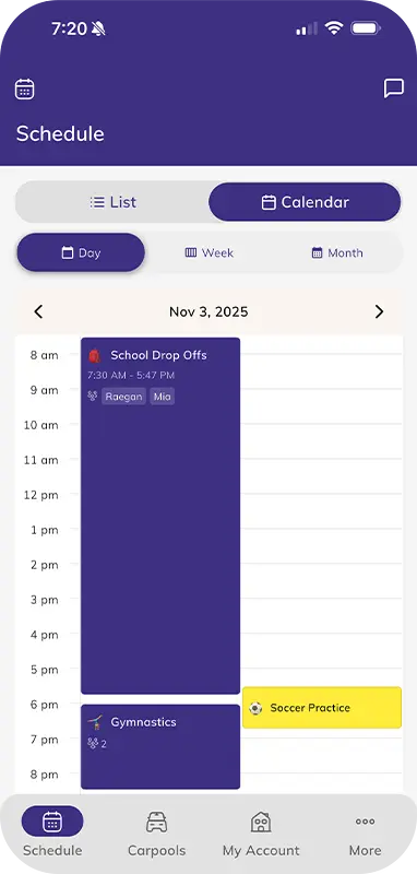 - See color-coded events for different carpools or activities