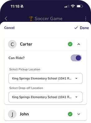 Add and manage multiple riders per family, each with their own pickup/dropoff locations, schedules, and availability settings.